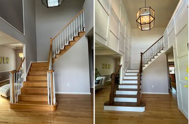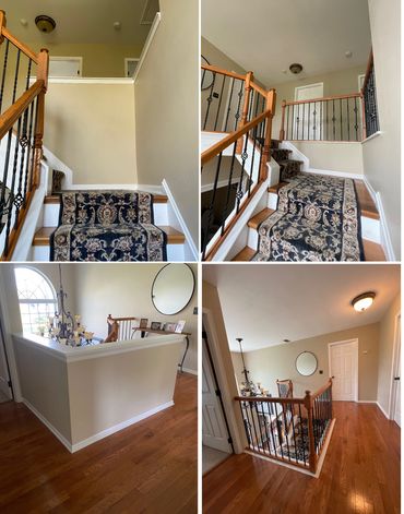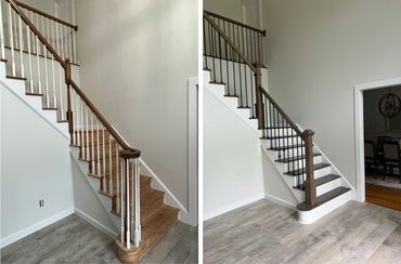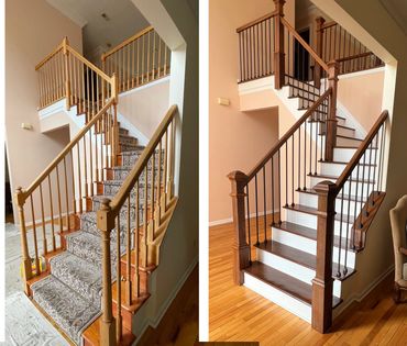 Replace wood balusters for wrought iron ones, stain or replace posts and railings, remove carpet, stain or replace treads